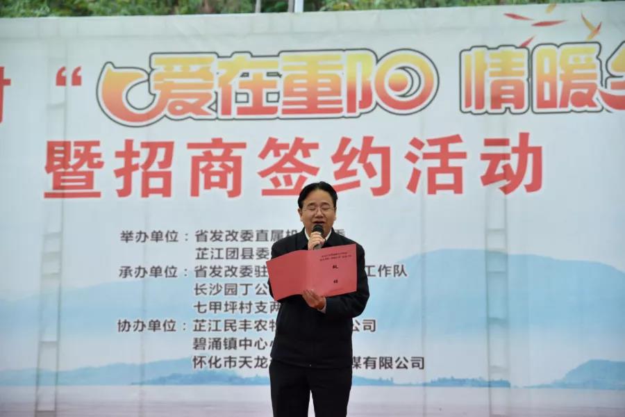 為弘揚(yáng)中華民族尊老的優(yōu)良傳統(tǒng),豐富老年人精神文化生活,關(guān)愛七甲坪村老年人,10月14日,由湖南省發(fā)改委直屬機(jī)關(guān)團(tuán)委、芷江縣團(tuán)委聯(lián)合主辦,省發(fā)改委駐七甲坪幫扶工作隊(duì)、長(zhǎng)沙園丁公益國(guó)學(xué)講習(xí)所、七甲坪村支兩委承辦的“愛在重陽,情暖鄉(xiāng)村”、“隆平文化驛站·高能環(huán)境七甲坪村站”授牌儀式在芷江縣碧涌鎮(zhèn)七甲坪村舉行。