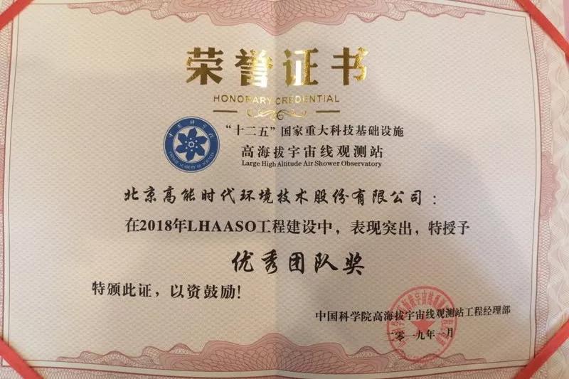 2019年1月20日,在中國科學(xué)院2018年“十二五”國家重大科技基礎(chǔ)設(shè)施項(xiàng)目高海拔宇宙線觀測站(LHAASO)工程建設(shè)總結(jié)會上,高能環(huán)境參建的“水契倫科夫探測器水池”(WCDA)特種防滲項(xiàng)目得到業(yè)主的高度認(rèn)可,并被授予“優(yōu)秀團(tuán)隊(duì)獎”,高能環(huán)境項(xiàng)目經(jīng)理田豐被評為“優(yōu)秀項(xiàng)目經(jīng)理”。